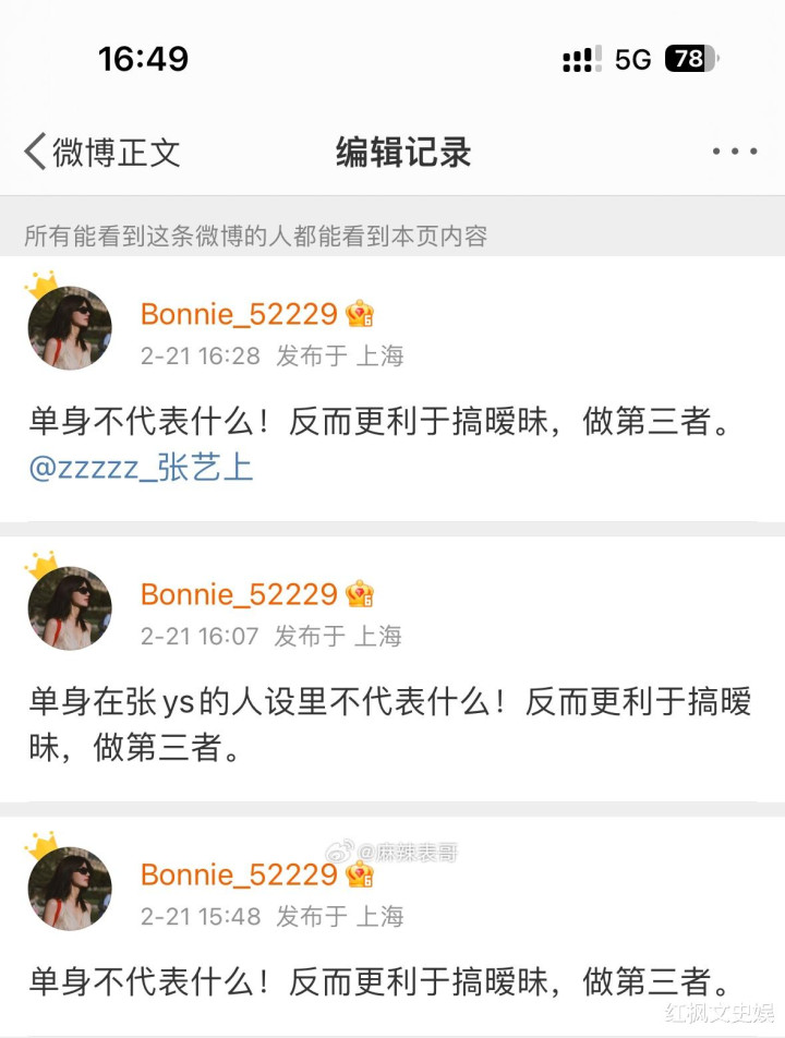 随后,她连续两次编辑内容,从隐晦的内涵缩写张YS,到最后直接艾特张艺上,言辞愈发激烈:“单身不代表什么!反而更利于搞暧昧,做第三者。”